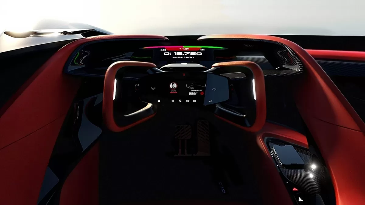 Tudo foi pensado para reduzir distrações e aumentar a conexão do motorista com a máquina. Volante pequeno, bancos em fibra de carbono e acabamento cru reforçam a proposta de pista — mesmo sendo um conceito.