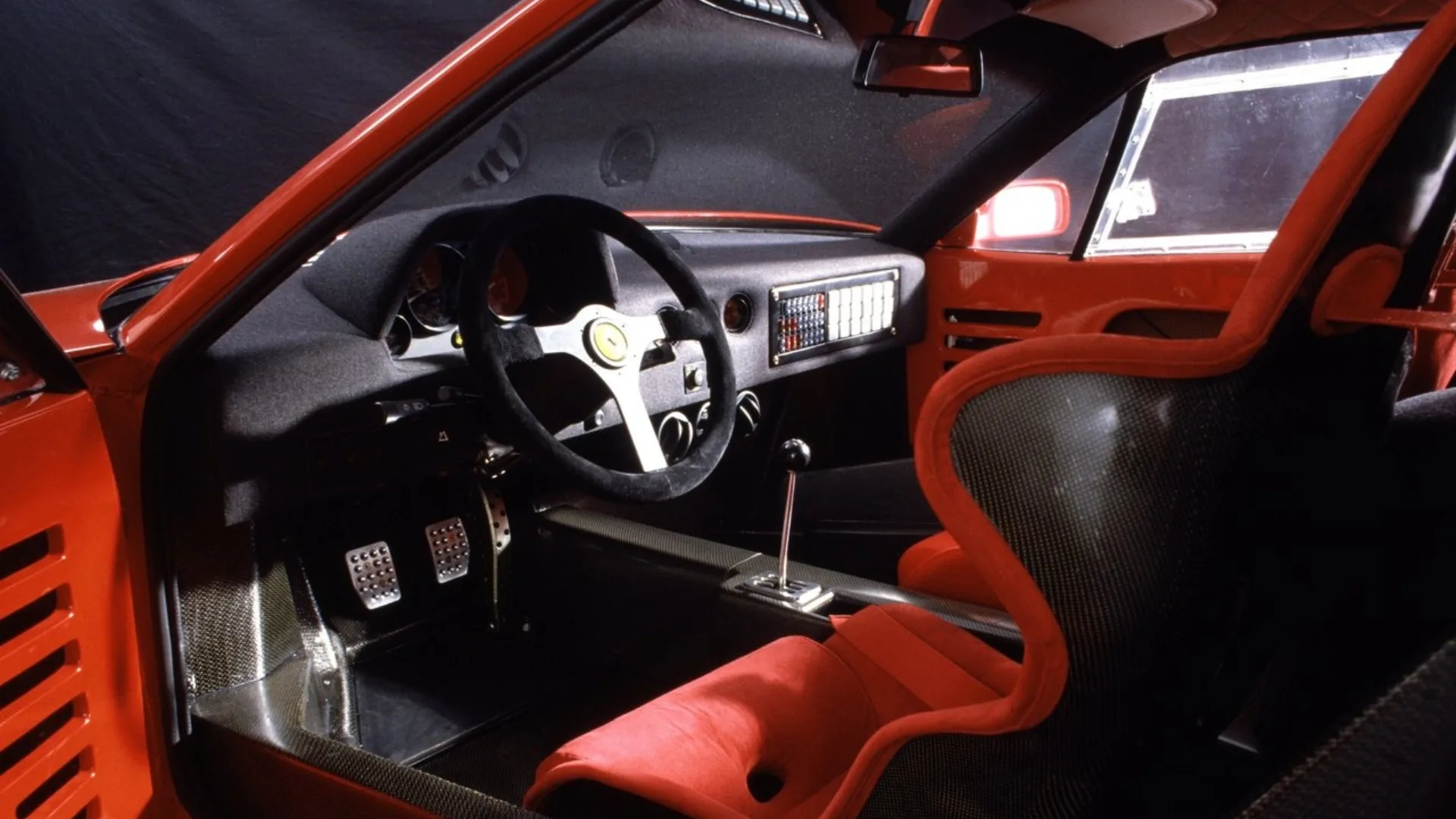 Se o exterior era funcional, o interior da Ferrari F40 era a definição de espartano. Enzo Ferrari acreditava que nada deveria distrair o piloto de sua tarefa, e a cabine da F40 é o reflexo fiel dessa filosofia.