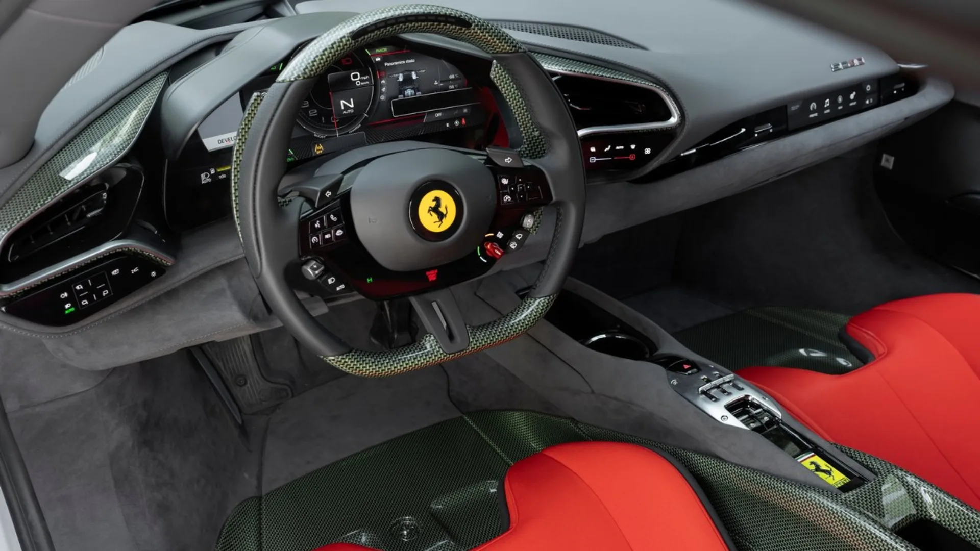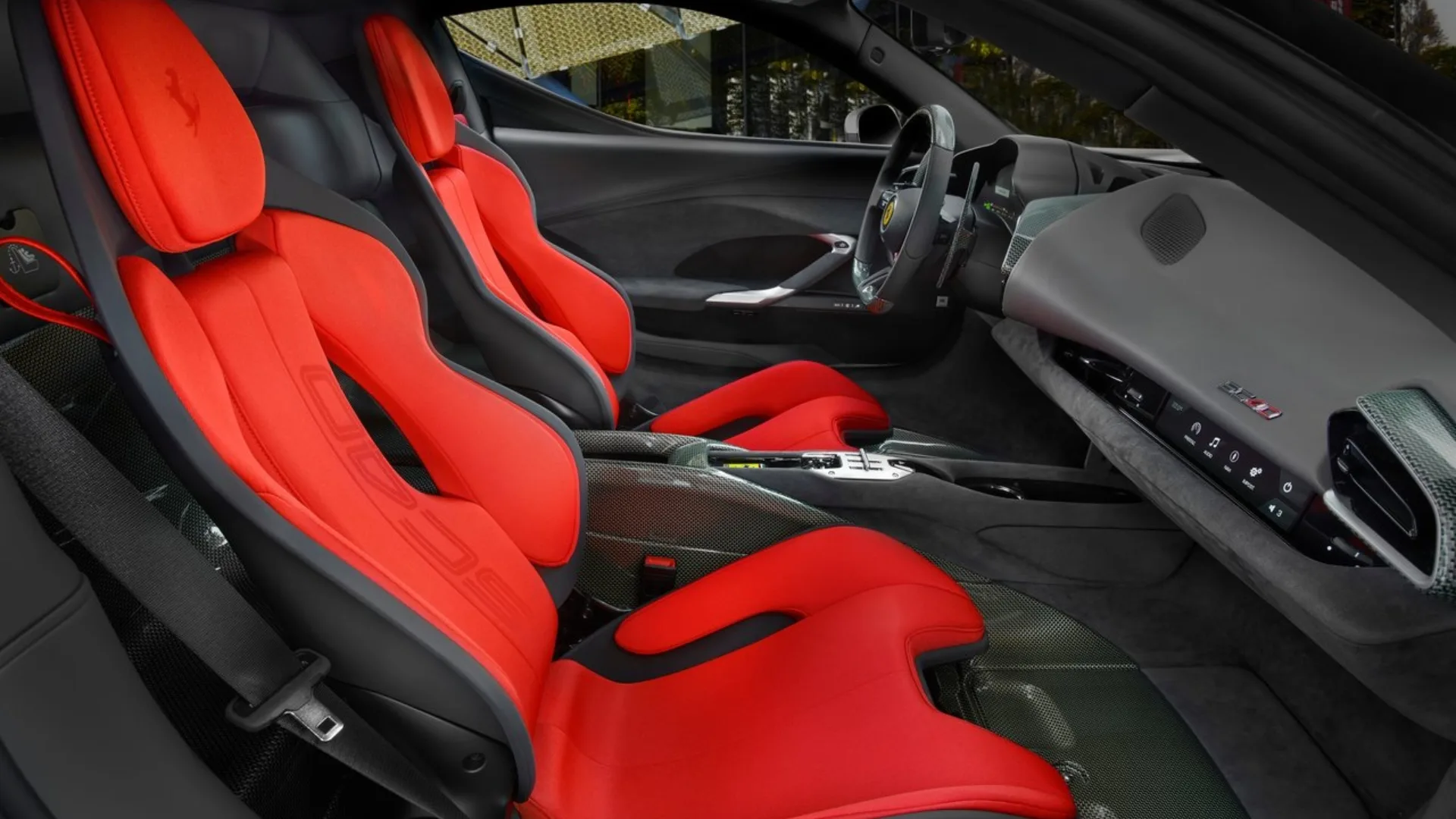O restante da cabine é uma mistura de Alcantara® na cor carvão e um tecido técnico jacquard vermelho. Os logotipos “SC40” e o Cavallino Rampante bordados nos encostos de cabeça dão o toque final de exclusividade.