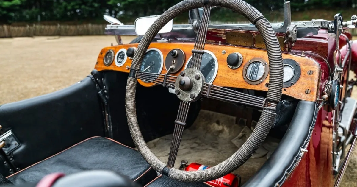 O ambiente era totalmente focado na tarefa de pilotar. Um grande e fino volante de madeira dominava a visão do condutor, acompanhado por um painel simples com apenas os instrumentos essenciais, dispostos como em um avião de época.