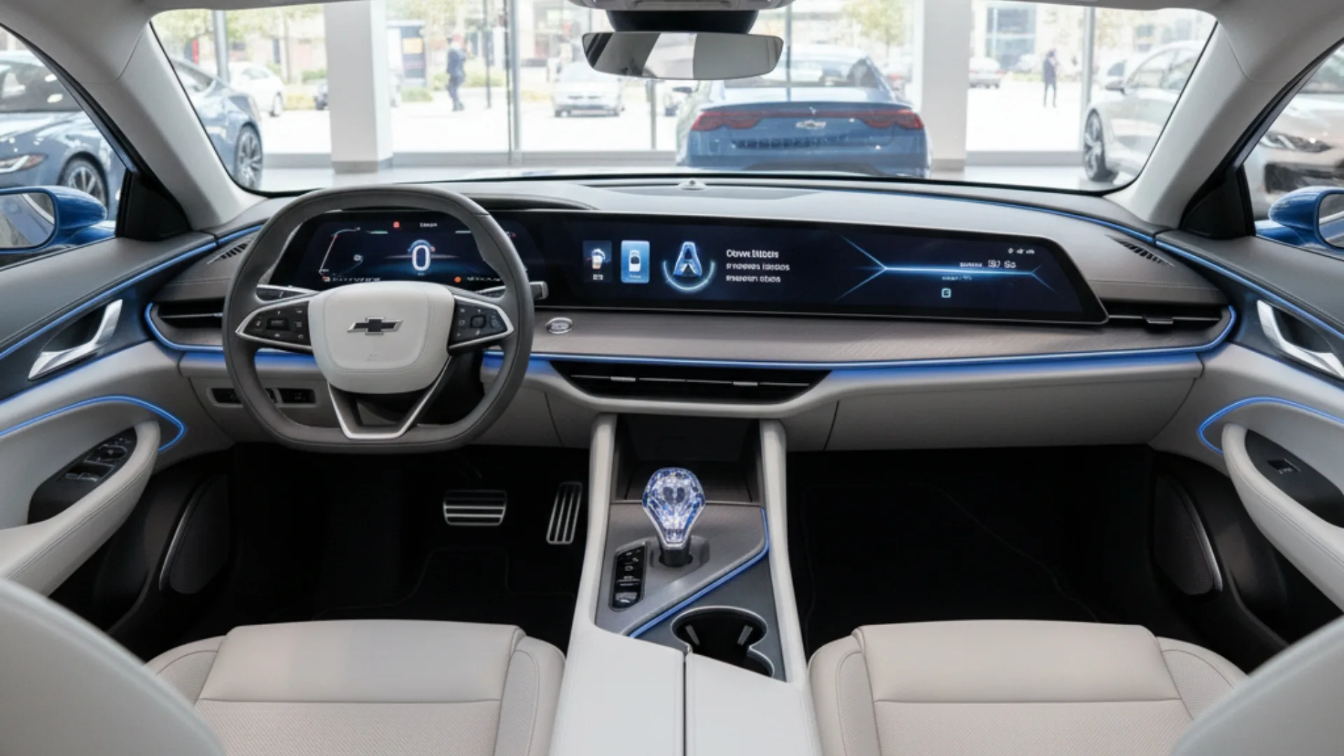 O console central é elevado e abriga um seletor de marchas em formato de cristal lapidado, botões sensíveis ao toque e um carregador por indução. O acabamento em couro branco, combinado com a iluminação ambiente em LED azul, cria uma atmosfera de “nave espacial”. É, sem dúvida, o interior mais impressionante e tecnológico já visto em um Chevrolet nacional.