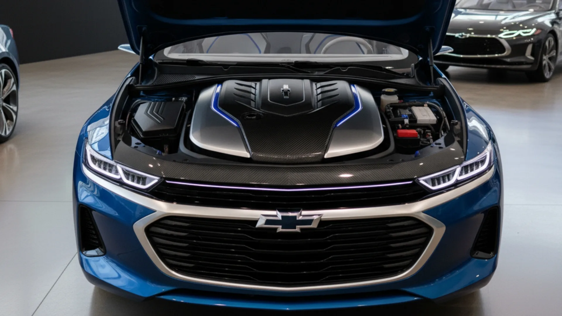 A dianteira é marcada por faróis de LED extremamente afilados e uma grade baixa, que canaliza o ar para o sistema de arrefecimento das baterias. O logotipo da Chevrolet, em uma nova interpretação iluminada, domina o centro.
