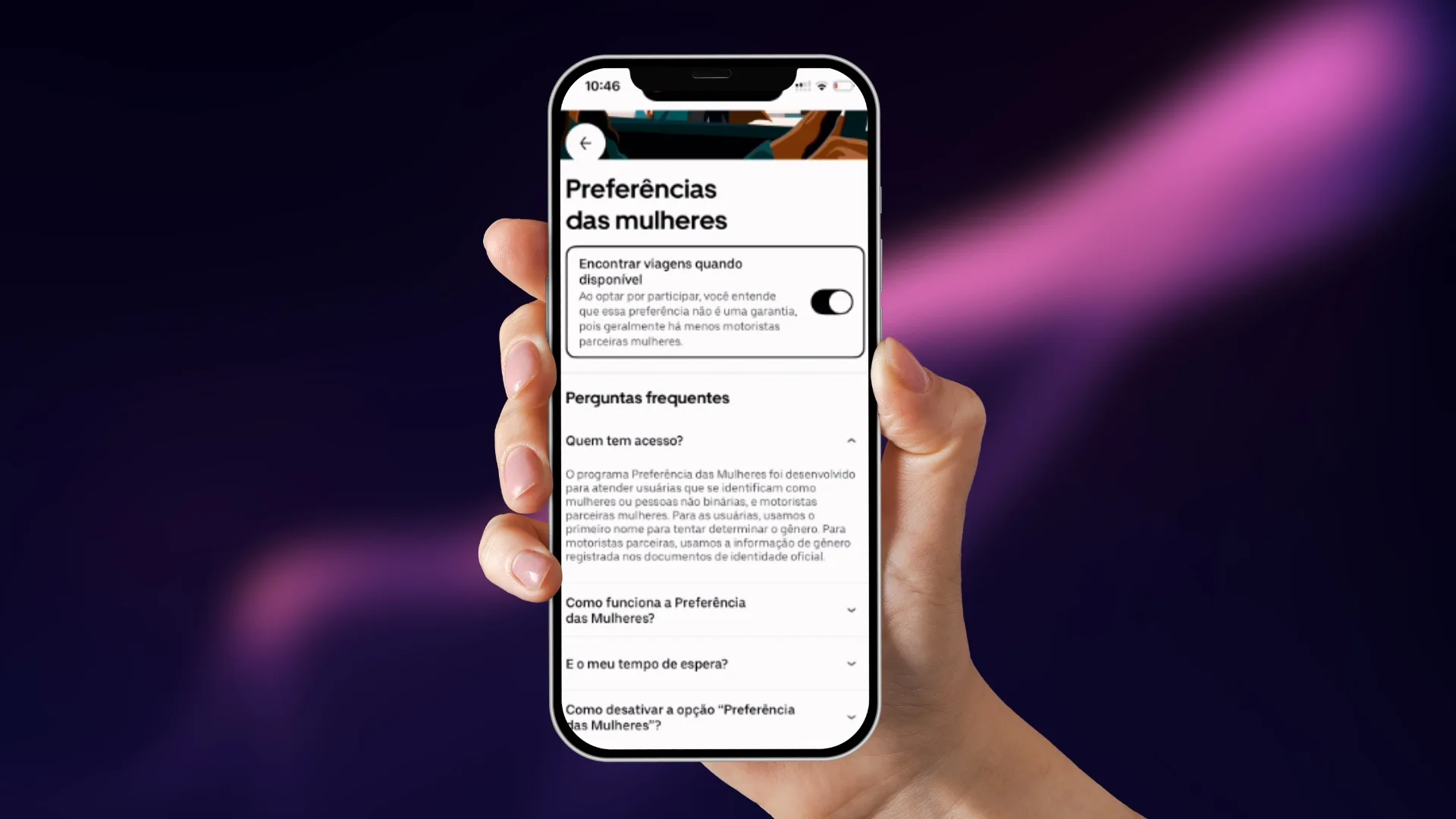 2. Preferência das Mulheres (Prioridade no Perfil) Esta é uma configuração de perfil que prioriza, mas não garante, uma motorista mulher.